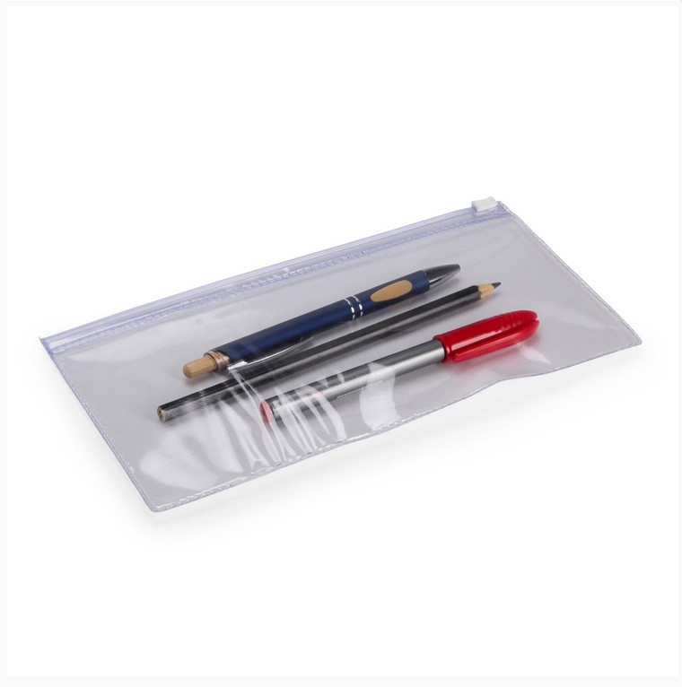 Estojo em plástico transparente com fechamento zip zap deslizante.
